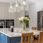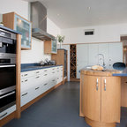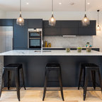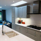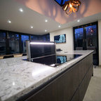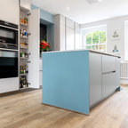 Fitted kitchen with handleless units from German manufacturer Schuller. There is a mix of truffle brown and sand grey satin lacquer finish colours with a white quartz stone worktop and a pear grey Formica breakfast bar. The main worktops are extra deep to allow more space and the kick out effect within the main U shaped worktop area is finished with a custom downstand to match the worktops. The use of miniature LED bulkhead lighting gives a stylish finish to the design. The floor is a grey wood effect porcelain and the glass splashback has a pale blue tint and was made in one single piece on each wall to avoid any joint lines.
