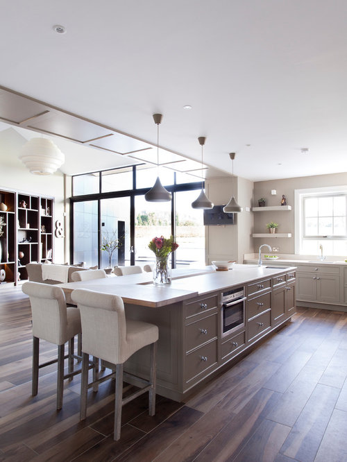 A stunning white contempoary acrylic white gloss kitchen with contrasting dark grey from our Contemporary Collection. The kitchen forms part of a major renovation & extension of an exclusive house in Malahide. 20mm Silestone Quartz countertop completes the look of this modern design with waterfall gable on the island. The kitchen features two sinks, a Faber downdraft extractor ...