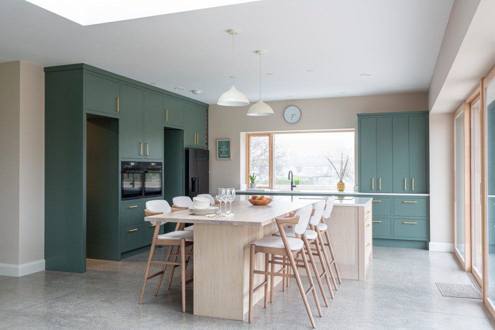 Constructed primarily as inframe slab, the cabinetry is painted in a matte greyish turquoise that’s been specially applied to allow the expressive oak grain to subtly emerge through. The light oak island and integrated dining table sit harmoniously against soft taupe walls, while crisp white quartz worktops and upholstered bar seating lift and brighten the entire space.