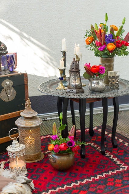 Cosas marroquíes, flores, colores, cosas de metal, velas, baúl.