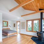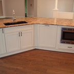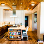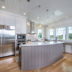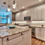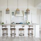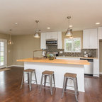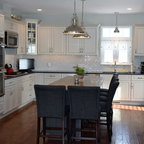 In this total gut and reconfiguration of the kitchen and adjacent spaces, a seamless marriage of farmhouse aesthetic with materials that are already in the home create a space that integrates with the feeling of the original home. Significant changes to the layout and removal of walls has created an open concept living, larger kitchen area, and an organized and functional kitchen space. New French doors connect to the outdoors and introduce more light into the space, as well as increased recessed and accent lighting assist in generating a light-filled home. The new layout provides an open, inviting entertaining space where children can play in the den while meals are prepared on the oversized island.
