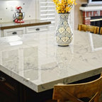 the backsplash is made out of beveled Bianco subway marble and the countertop is a combination of gray and white quartz material.