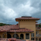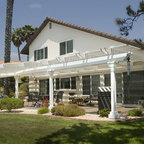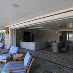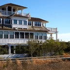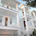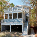 All exterior colors are Sherwin Williams. The original wall (Hardy Plank siding) color was Tradewinds (SW 6218) but we recently repainted the front porch and found it necessary to switch. After five years of sun, the color had faded to more of a blue-grey tone and the best match I could find was Misty (SW 6232). The trim color is Oyster (SW7637. The garage door as well as the porch ceiling color is Moody Blue- SW 6221. Fot the shingle colors- we tried something new- mixed stain with paint (Rain- SW 6219) (using a 5 to 1 stain/paint mix) and dipped the shingles in this once or twice.